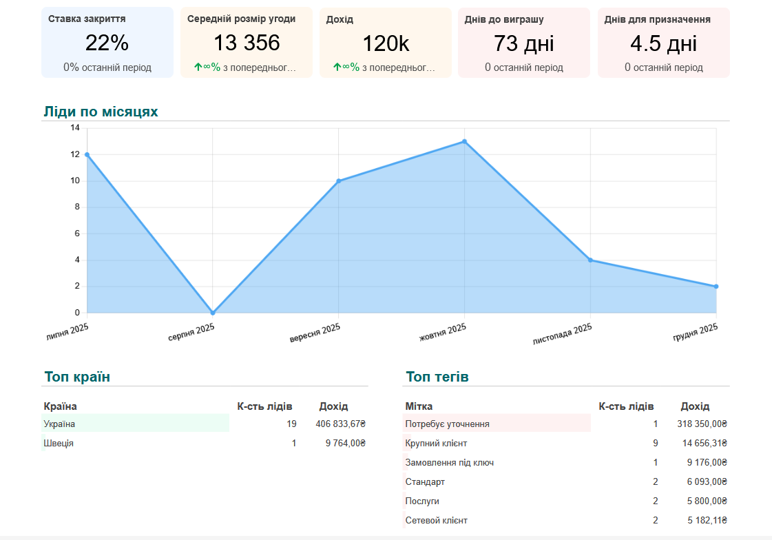 Отримуйте дані про активність лідів, ефективність команди та конверсії угод.